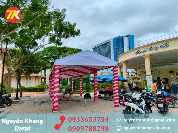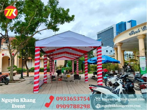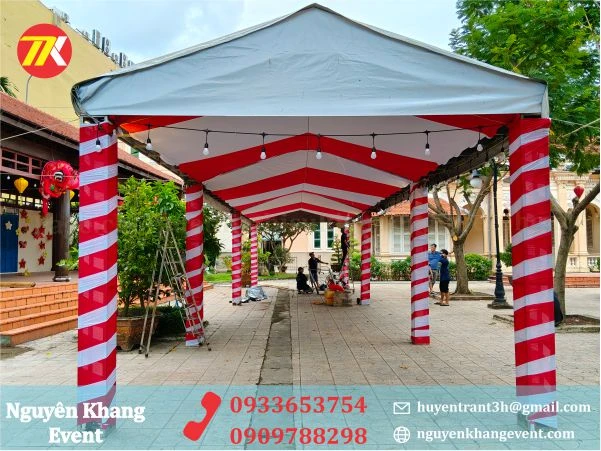 - Nhà bạt không gian được team Nguyên Khang thi công lắp đặt chắc chắn , an toàn, kèm trang trí quấn trụ màu trắng đỏ theo yêu cầu khách hàng.
